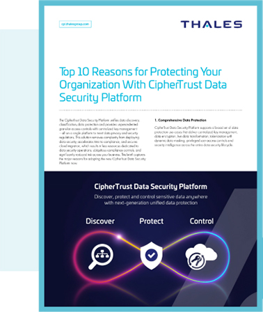 | Organizations like yours need an easier and unified approach to discover, protect, and control their sensitive data in order to meet current and future data security threats, evolving global and regional privacy regulations, and cloud adoption. To meet this need, Thales has pushed the innovation envelope with the CipherTrust Data Security Platform. |